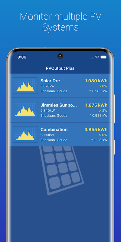 Manage your PVOutput.org PV Systems from this app. The site PV Output provides a free way to publish your PV system output. With this app you have access to the data on PV Output in an easy way. You can: