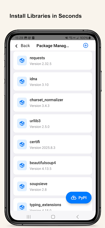 • Gerenciador de Pacotes PyPI – Instale e gerencie bibliotecas Python diretamente no aplicativo.