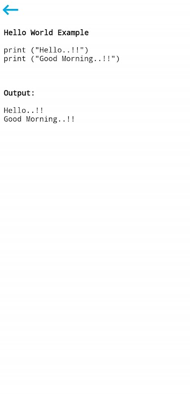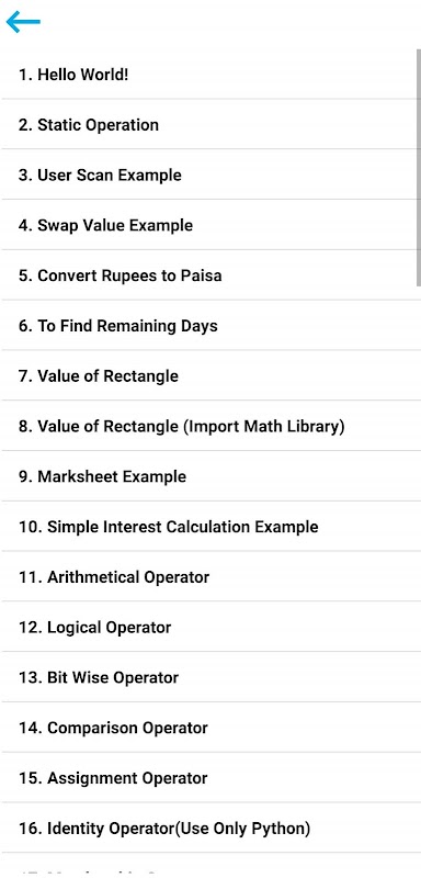 Você pode usar o aplicativo Python Tutorials passo a passo e muito mais para aprender o conceito básico de Python do nível inicial ao avançado.
