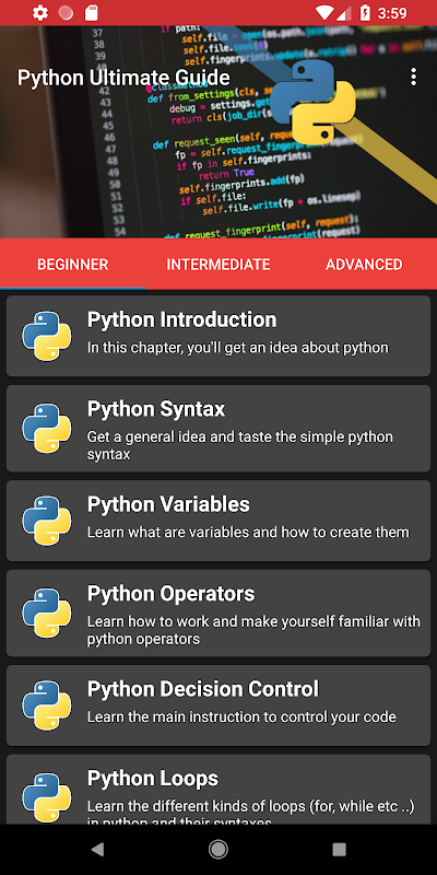 Python Ultimate Guide is an app to help you learn python programming language, it is intended for advanced programmers and also beginners ! the app includes a set of lessons divided in three sections :