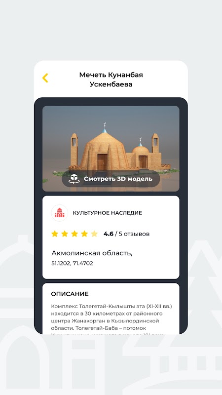 O aplicativo é adicionado a mais de 100 modelos em formato 3D populares destinos turísticos no Cazaquistão. Cada usuário será capaz de se familiarizar com as vistas e obter todas as informações necessárias em uma apresentação interessante.