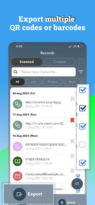 Compartilhe e exporte seu histórico de digitalizações como um arquivo CSV. É especialmente adequado para o uso extensivo de leitura de códigos QR e códigos de barras.
