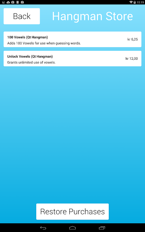 We recommend that instead of actually purchasing vowels inside this official release, download Qt and run the example from the Qt Purchasing module against your own store entry where you have registered as a test user. You will then be able to test the purchasing functionality without actually paying.