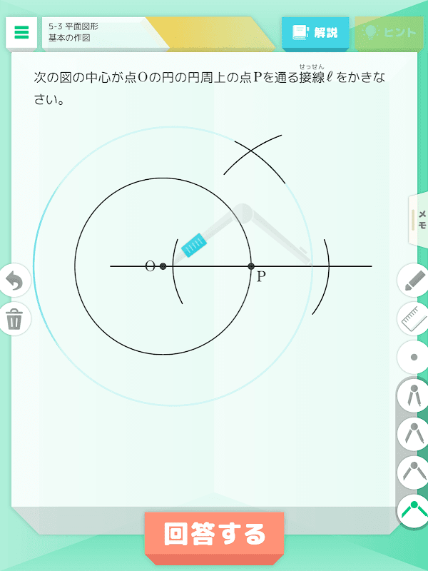 実際のノートと同じように全て手書きで学習を進めます。自動の文字認識、正誤判定、メモ機能によってタブレット1つですべての学習が完結します。ヒントや解説アニメーションも充実「定規・コンパス・分度器を使った作図」や「関数のグラフ作成」にも対応しています。手書き文字の認識はMyScriptⓇの技術を採用しています。