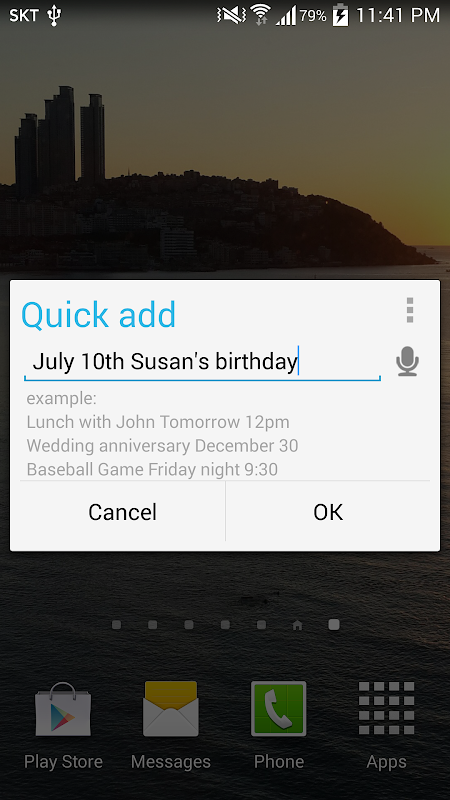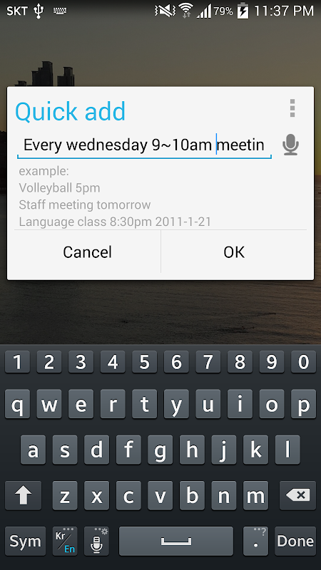 Add Rápida é um utilitário impressionante que ajuda a adicionar um novo evento em um piscar de olhos. Com Add Rápida, você pode adicionar um novo evento com texto ou com sua voz. O nosso motor de análise de linguagem natural compreende vários formatos de data / hora e faz a adição de um novo evento mais fácil do que nunca. Também nós fornecemos vários ajustes, tais como calendário padrão, lembrança personalizada, etc
