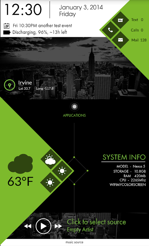 Set against the New York City skyline, this black, green and white theme is packed with information. Time, date, battery percentage (with estimated time left until depletion) and next calendar appointment keeps you organized. Missed indicators for phone, messaging, and email alert you to new communications. A music player lets you control your tunes, while system info shows you key device stats such as available storage and WiFi connection status. And on the left, you can see the current weather conditions along with a three-day forecast.