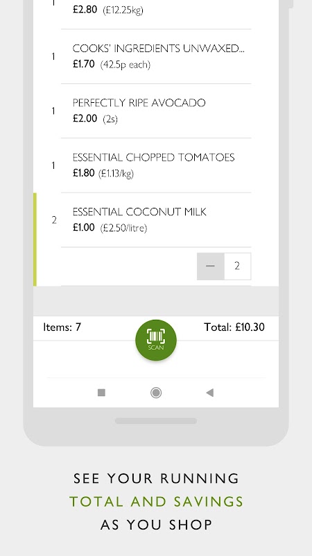 Esta aplicação permite-lhe, como cliente myWaitrose, digitalizar as suas compras à medida que vai avançando através do seu smartphone. Basta digitalizar e embalar seus itens diretamente em suas malas. Você verá um total de seus gastos em seu telefone, além de ouvir um bipe para alertá-lo sobre ofertas especiais. Quando terminar é só pagar e ir embora, sem a necessidade de desfazer as malas no caixa.