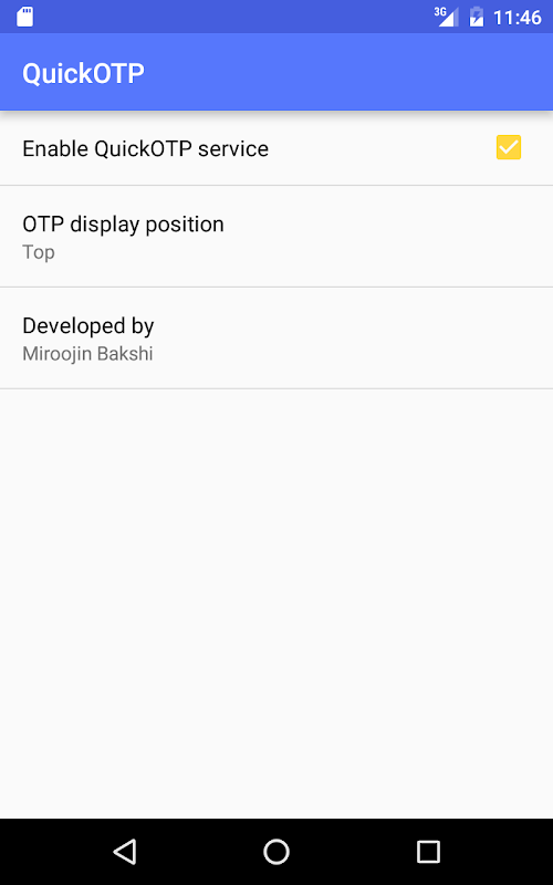 For users handling with money transactions online (online shopping, bank transfers, mobile recharge/top-up), it can become cumbersome to deal with One Time Password (OTP) based authentications. The user has to switch to the messaging app, open the appropriate SMS and memorize/copy the OTP every time. With QuickOTP, you can bypass this process. QuickOTP displays the OTP in a lucid and non-intrusive manner along with an option to quickly copy the OTP as soon as you receive your OTP message. The user does not have to switch apps during the transaction.