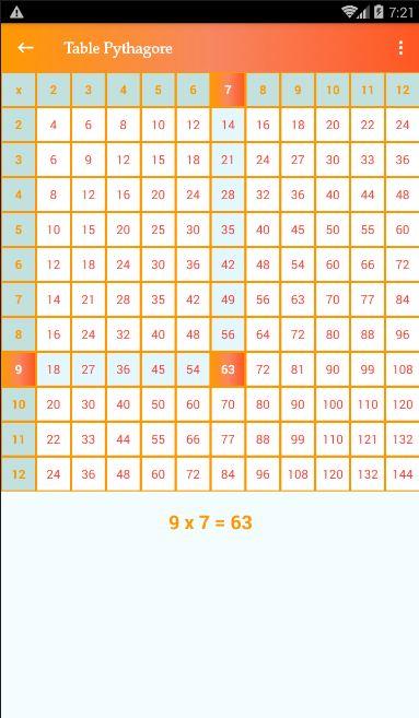 ★ Table Pythagore : Vous trouverez aussi dans cette application des tables de multiplication la table de Pythagore qui présente les entiers naturels sur la première colonne et la première ligne d’une grille à double entrée permettant de mettre en évidence le produit de leur multiplication par la prise en compte du nombre se trouvant à l’intersection d’une ligne donnée en regard d’une colonne donnée.