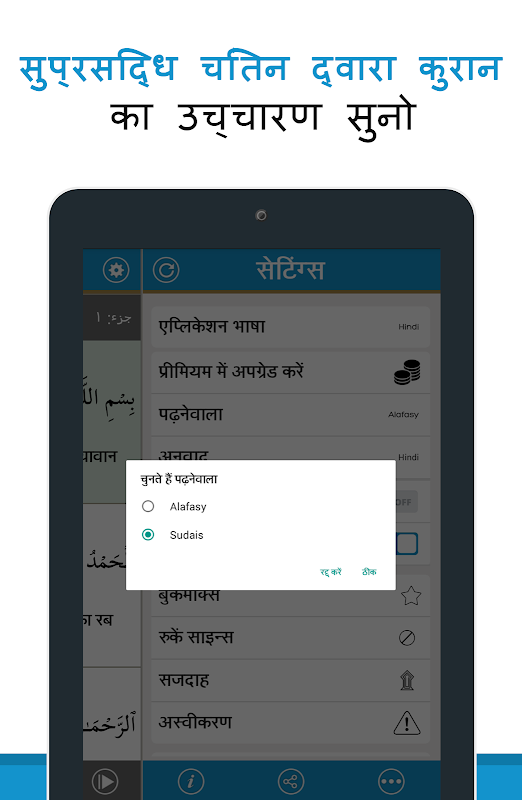 • Alcorão com tradução Hindi, transliteração e Quran recitação