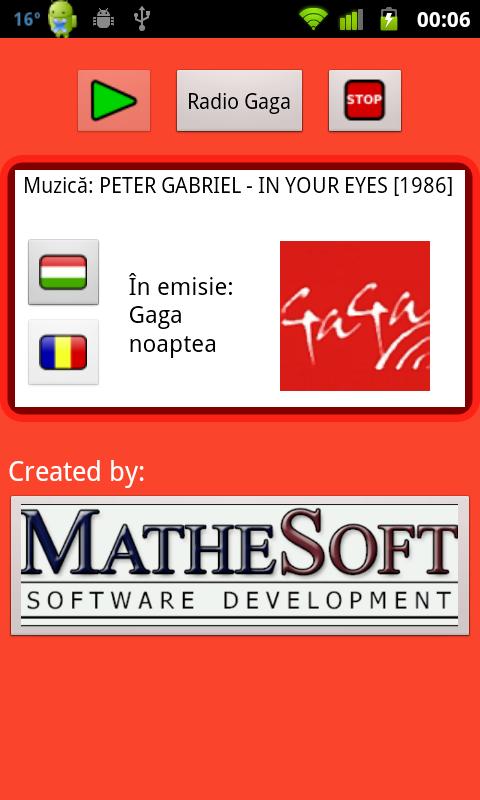 Na imagem o: "Zene: PETER GABRIEL-EM SEUS OLHOS ..." é o "jogar agora" eo "programa é:" A maioria adásban: Gaga éjszaka "e uma imagem ner as informações que são solicitadas text.Those e analisado a partir do site radiogaga e exibida no aplicativo. Só por esta informação é as configurações de idioma, que pode ser única língua húngara e romena no momento.