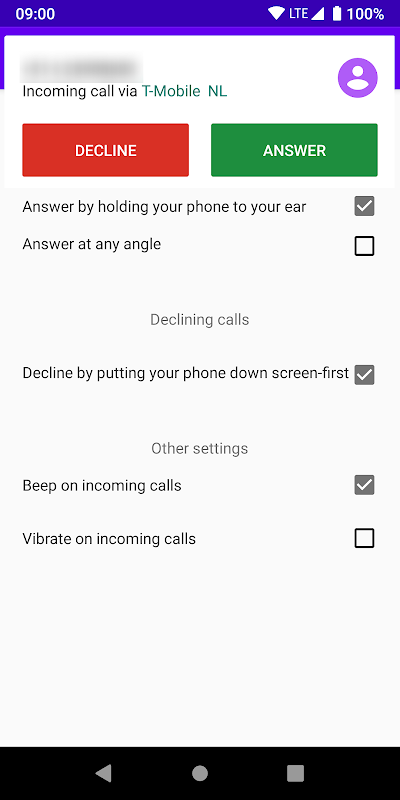 Basta segurar o telefone junto ao ouvido para atender uma chamada. Quando o aplicativo detecta que o telefone está próximo ao seu ouvido durante uma chamada, ele bipa 5 vezes e atende a chamada.