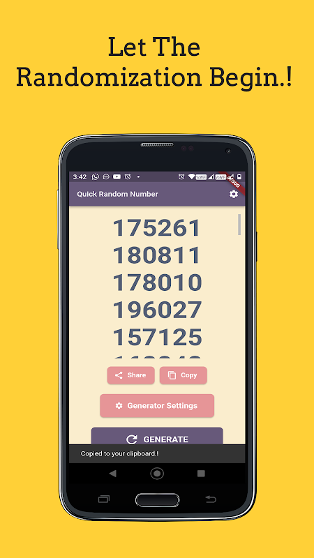 Copie números aleatórios facilmente para a área de transferência ou compartilhe-os por mensagens, e-mail ou notas. Ótimo para colaboração ou registro.