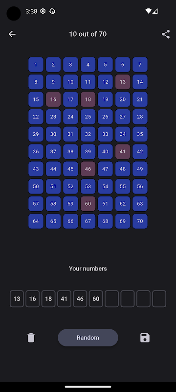 Às vezes você precisa de ajuda com os números da loteria. Digamos que você jogue na Canadian Lotto MAX, que requer 7 números exclusivos. Você pode ter de 2 a 3 números favoritos em mente, mas precisa de mais alguns para completar sua seleção. Números aleatórios sugerirão o restante dos números. Você pode desmarcar alguns dos números e selecionar outros. Alternativamente, toque no botão Aleatório para seleção automática. Salve seus números para mais tarde, compartilhe-os com seus amigos ou exclua-os e comece novamente. Os números salvos são armazenados no seu dispositivo. Você também pode configurar seus números Lucky e Evite.