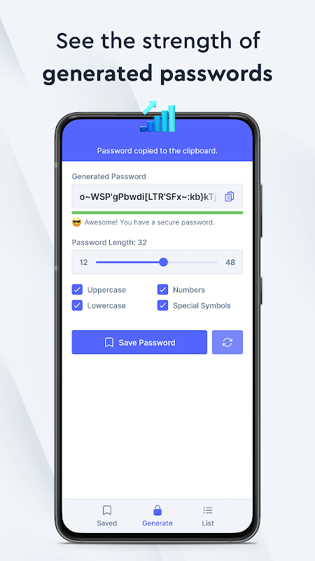 Você pode gerar senhas fortes aleatoriamente com uma combinação perfeita de letras minúsculas e maiúsculas, números e símbolos especiais. Você pode criar senhas entre 12 e 48 caracteres e regenerá-las quantas vezes quiser. Aproveite a comodidade de criar as senhas mais seguras com um campo informativo que mostra a dificuldade ou força da senha. Criar senhas com o Password Generator é rápido, fácil e confiável.