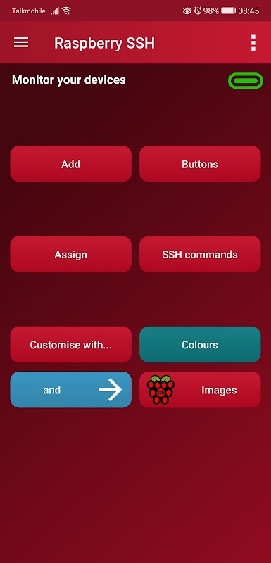 Raspberry SSH é um aplicativo Android projetado para controlar um dispositivo por meio da criação de botões SSH. Crie um botão. Configure seu comando e pressione o botão para executar.