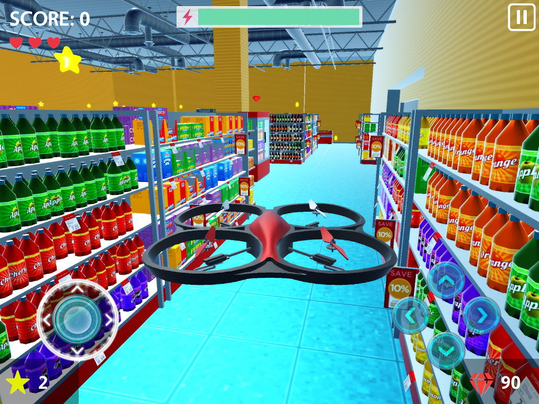 Pilote drones controlados remotamente e colete estrelas em três lugares diferentes: Escritório, Supermercado e Armazém.