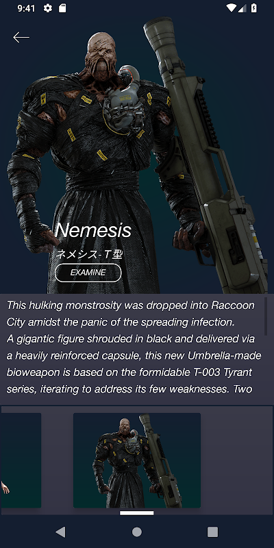 Além das informações fornecidas para cada personagem/B.O.W, o usuário também pode examinar determinados modelos de personagens e armas usando um visualizador interativo no aplicativo.