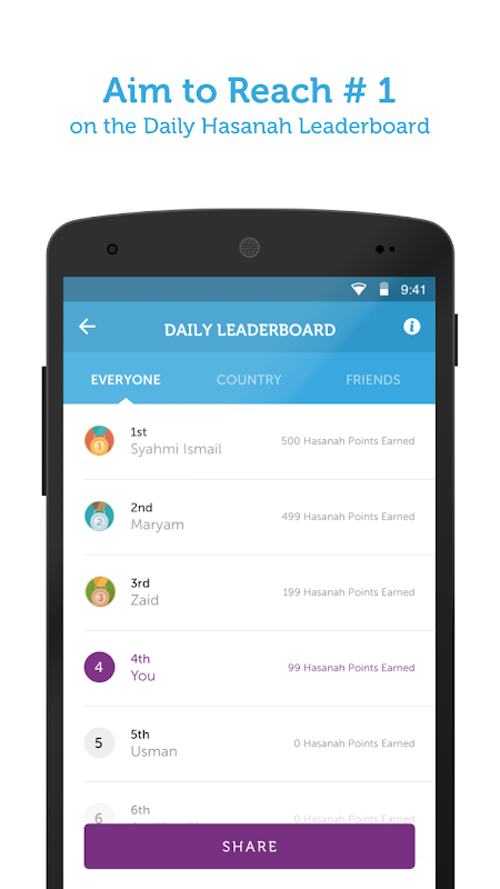 * Diariamente Hasanah Leaderboard: É narrado que o Profeta SAW disse quem recita uma carta do Livro de Allah SWT, recebe a recompensa (Hasanah) de dez para cada letra. Nossa calculadora Hasanah calcula seus pontos Hasanah para você como você progride em sua memorização. The Daily Hasanah Leaderboard, em seguida, mostra os principais usuários 100 com os pontos mais altos Hasanah e fica repor diariamente! Desafie-se a ser na placa ao inspirar outras pessoas a memorizar também.
