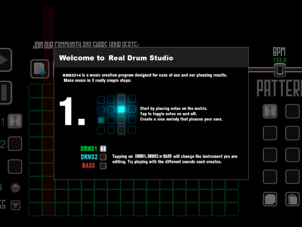 A beatmaker Música App para criar música em todos os lugares em 3 etapas fáceis. Crie a sua música com que boa selecção de samples de bateria reais, também com notas graves para criar batidas impressionantes com tambores agradáveis e um baixo gordo.