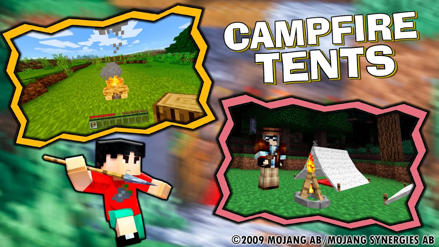 Este aplicativo de pixel contém uma fogueira funcional realista, tendas e mod de acampamento.