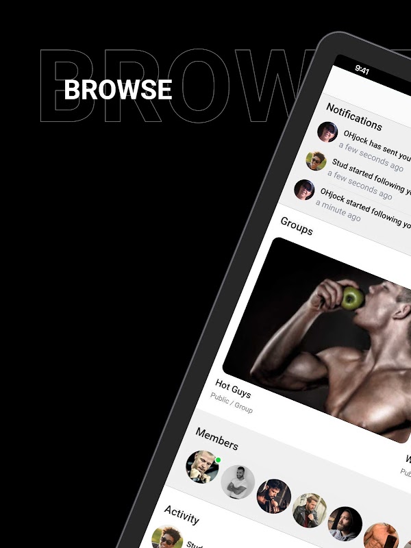 Envolva-se e conecte-se com entusiastas do fitness gay, atletas e seus fãs. Converse, compartilhe fotos, junte-se a grupos e faça conexões pessoais com outros homens com interesses semelhantes. Navegue pelas galerias de fotos de belos corpos, atletas em forma e caras gostosos. Crie ou junte-se a grupos privados para cada tipo de interesse ou fetiche.