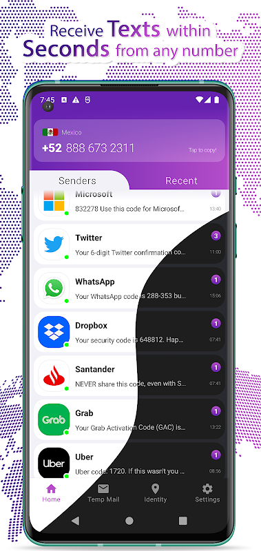 "Receive SMS: Temp Number, Temp Mail" é um serviço de número SMS gratuito (texto grátis online) para receber mensagens SMS online, baseado em SIM REAL e mostra as informações exatas recebidas pelo modem com Dynamic Sender ID. Neste aplicativo você pode verificar se recebe SMS online em diferentes rotas, ou se recebe usando o recurso Dynamic Sender ID.