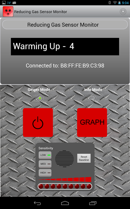 The Reducing Gas Sensor Monitor app can be used to detect the presence of reducing gases using the Sensordrone. Applications include finding gas leaks near your furnace, grill, or even vapors from lighters and solvents. There are two modes available. The Geiger Mode alerts the user when gases are higher than normal by lighting up the LEDs on the console and increasing the frequency of the audible "tick". Info Mode provides informative pop-ups that explain more about reducing gases and how the sensor works.