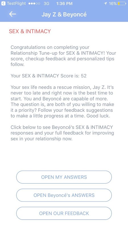 • 4 categorias distintas: Sexo & Intimidade; Comunicação; Amigos e Família; Dinheiro & Lifestyle. realimentação separado para cada categoria para que você possa se concentrar nas necessidades particulares de seu relacionamento