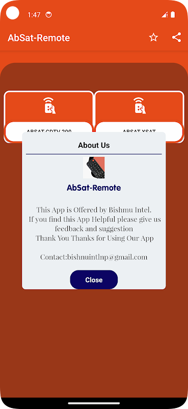 Remote for ABSat é um aplicativo independente desenvolvido pela Bishnu International e não é oficialmente endossado ou afiliado à ABSat. Todas as marcas comerciais e marcas registradas mencionadas no aplicativo são de propriedade de seus respectivos proprietários. O aplicativo fornece uma solução alternativa de controle remoto para dispositivos ABSat.