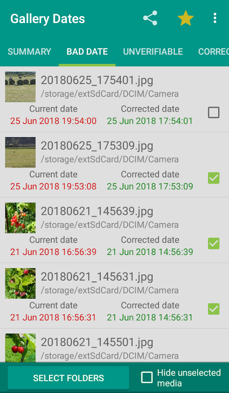 O aplicativo pode processar todos os tipos de imagens e vídeos. Corrige o banco de dados MediaStore para que as imagens e vídeos sejam exibidos corretamente na galeria. No entanto, a aplicação não mexe nos ficheiros e, em particular, não altera a sua data e não modifica os dados EXIF.
