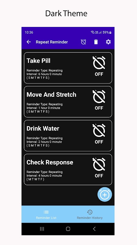Este aplicativo ajuda você a definir lembretes únicos ou recorrentes de todas as suas atividades diárias (exercício, bebida, alimentação, sono, medicação, trabalho e.t.c).