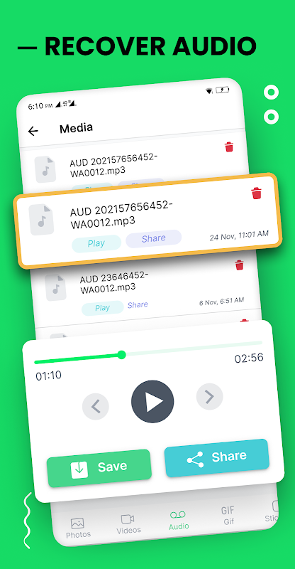 Deseja recuperar fotos e vídeos apagados de suas conversas do WA? Este aplicativo de recuperação de mensagens apagadas foi desenvolvido para restaurar fotos, vídeos e até mesmo arquivos como documentos ou notas de voz removidos pelo remetente. Agora você pode acessar todas as fotos, mensagens e todos os arquivos de mídia apagados facilmente, mesmo que eles desapareçam do chat.