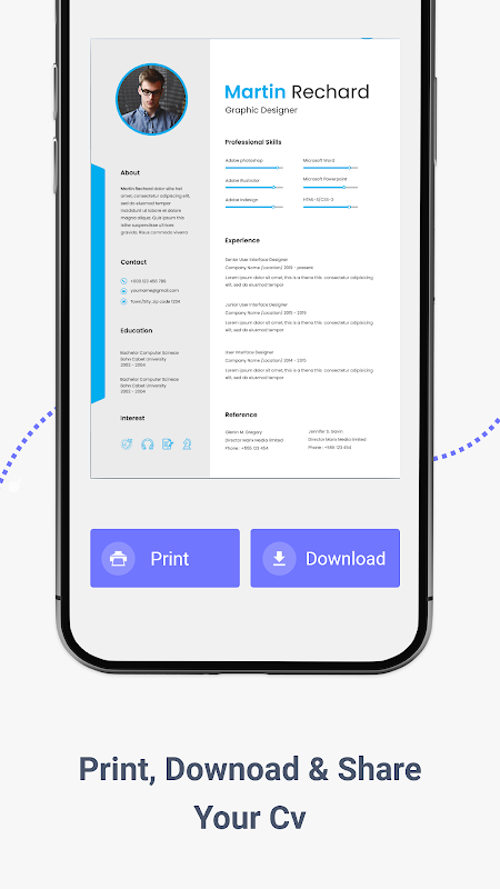 Você pode manter seu currículo profissional atualizado inserindo seus dados a qualquer momento e facilmente baixar o currículo ou imprimi-lo com o criador de currículos gratuito. Toda vez que você puder mostrar, imprimir ou baixar currículo em um modelo de currículo exclusivo. A redação de currículos ficou mais fácil com o Construtor de currículos - Criador de currículos