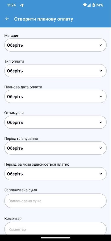 На цьому етапі додаток призначений для автоматизації процесу планування та обліку платежів торговича тікп. Він дозволяє формувати шаблони оплат, календар оплат і вносити факт з передачею підтверджуючих документів для аналізу та обробки в центральному офісі.