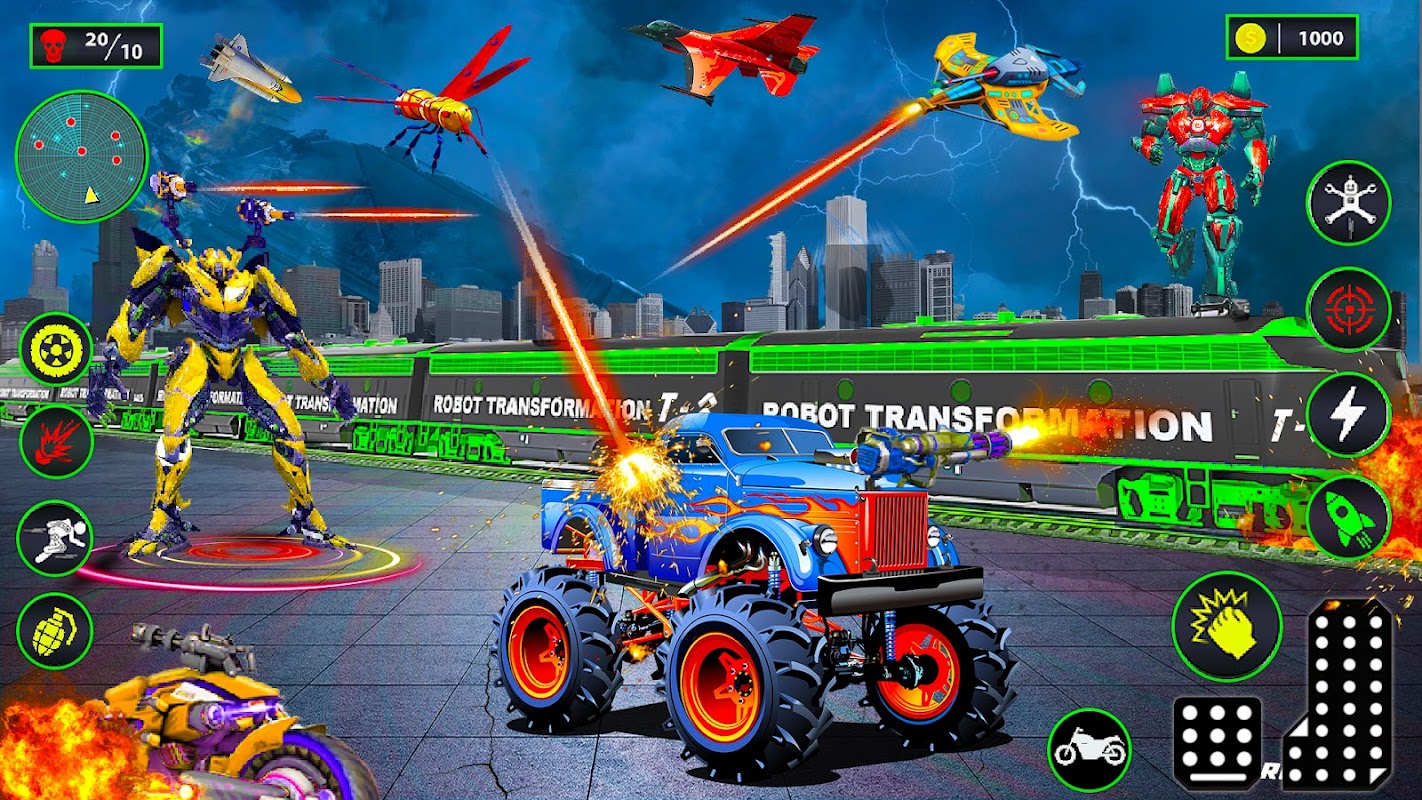 A batalha de robôs do exército e carros de robôs voadores está ocorrendo na cidade. Agora é sua chance de destruir todas as perigosas guerras de robôs. Neste jogo de robô Jetfighter e jogo de condução de tanque de robô, você tem controle total sobre a cidade novamente, lutando contra jogos de jatos de ar de helicóptero.