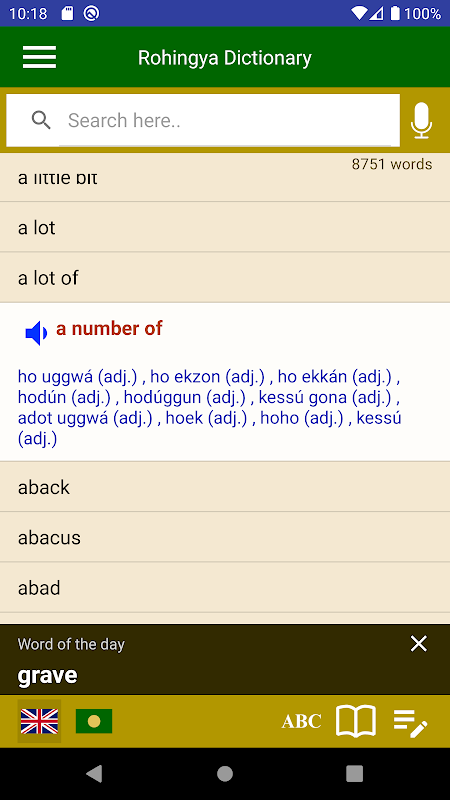 Este é o primeiro aplicativo de dicionário para tradução de Rohingya para Inglês e de Inglês para Rohingya baseado no sistema de escrita Rohingyalish. Ele também contém dicionários de inglês para árabe e de inglês para bengali. As palavras estão listadas em ordem alfabética. Você pode navegar ou pesquisar rapidamente uma palavra na lista e tocar na palavra desejada para ver sua tradução.