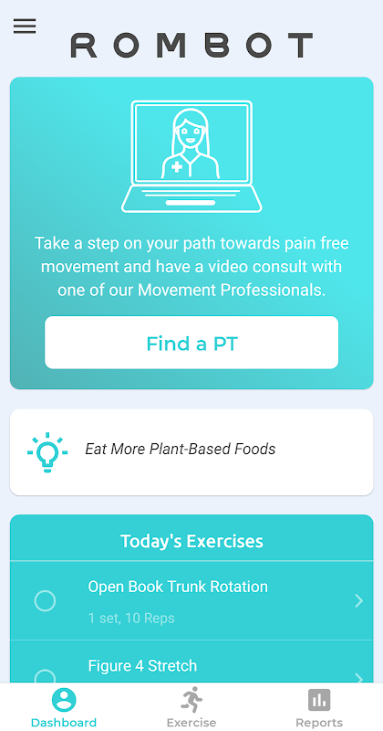 The ROMBOT mobile app is to get patients moving! Track and follow your personalized home exercise programs to build strength and flexibility.