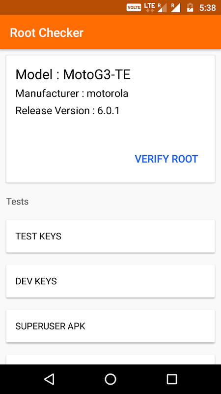 Verify proper root access is configured, Root Checker shows the root status of phone by checking four tests.