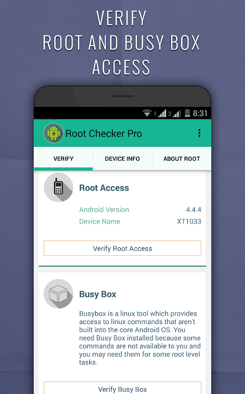 The goal of this application is to provide the newest Android user with a simple and reliable method to check their device for root (administrator/superuser) access and allow user to check busy box. This is a very simple and easy to use application to notify the user whether or not they have properly setup root (superuser).This application will also allow user to check installation of busy box with one click.