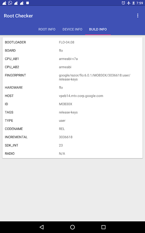 O aplicativo Root Checker fornece as seguintes informações ao lado do acesso root (superusuário):