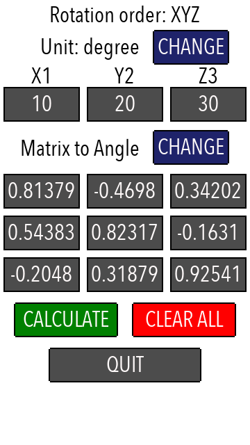 Você digita o ângulo e, com um clique, obtém a matriz de resultados para a ordem dos eixos XYZ, XZY, YXZ, YZX, ZXY, ZYX, XYX, XZX, YXY, YZY, ZXZ, ZYZ.