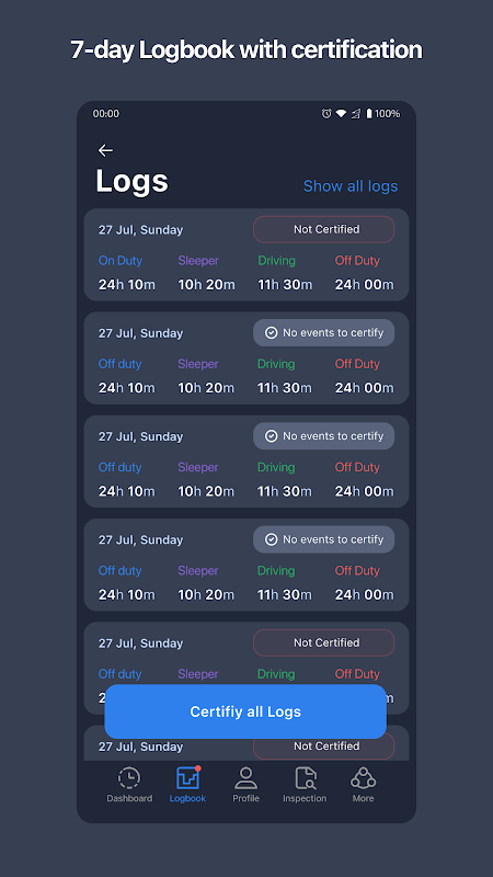 - Gera relatórios de conformidade ELD detalhados e profissionais para autoridades com o toque de um botão.
