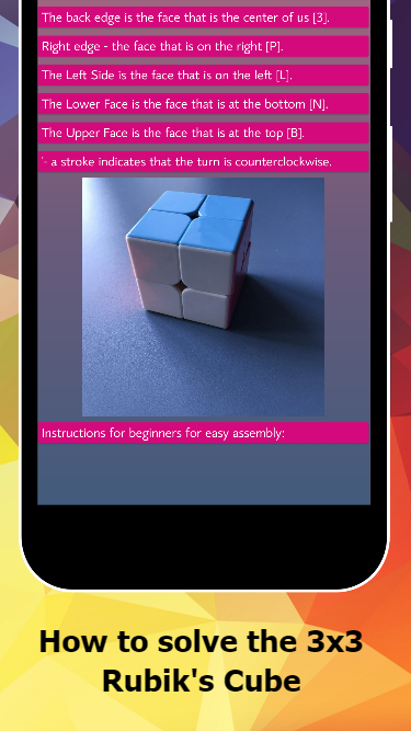 Rubik's cube solver is a scheme for beginners. Rubik's cube solver 3x3 shows the assembly of the classic Rubik's cube. Effective puzzle training is fun with our instruction. Rubik's cube solver app is the right way to learn how to collect a cube and train logical thinking.