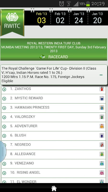 Get Live Race results and race information such as Handicaps, Acceptances, Declarations, Race Card and Race Results for the races at Royal Western Turf India Turf Club (RWITC), Mumbai.
