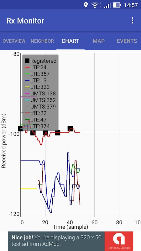 O gráfico para o nível de sinal também está disponível e pode ser ampliado (pinch-zoom) e rolado (deslizar na diagonal). A guia Eventos mostra as alterações no status do telefone que podem ser de seu interesse. A guia Mapa mostra as informações sobrepostas em um mapa (o GPS deve ser ativado primeiro).