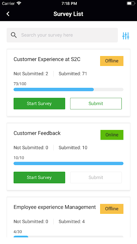Survey2Connect’s field force app lets you collect data in an offline mode with out the need of internet connection. The responses can be submitted anytime whenever you have internet available. You can use it for field surveys, in your stores, offices or during a conference. The app can also be used for doing audits and mystery shopping.