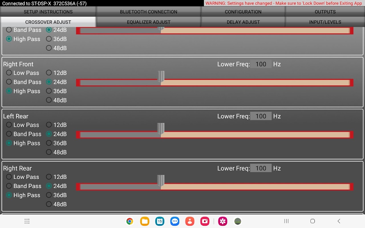 O aplicativo Saddle Tramp ST-DSP-X oferece controle total sobre seu sistema de áudio com apenas alguns toques em seu smartphone ou tablet. Você pode ajustar os pontos de cruzamento, ajustar o atraso e até mesmo ajustar seu sistema de áudio com 31 bandas de equalização gráfica por canal. Isso significa que você pode personalizar sua experiência auditiva de acordo com suas preferências, independentemente do tipo de música que você adora.
