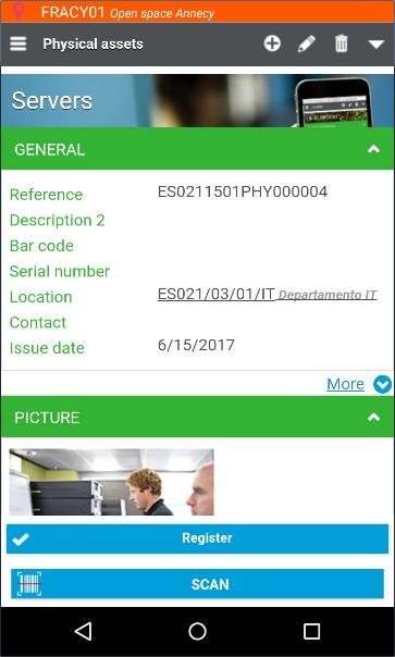 • Registar os ativos físicos através do scan do código de barras. Os ativos físicos podem ser registados através do scan do seu código de barras e marca-los como contados. A aplicação vai gerir a leitura do código de barras através do emparelhamento do scanner ou através duma dedicada aplicação (Zxing, QR droid)