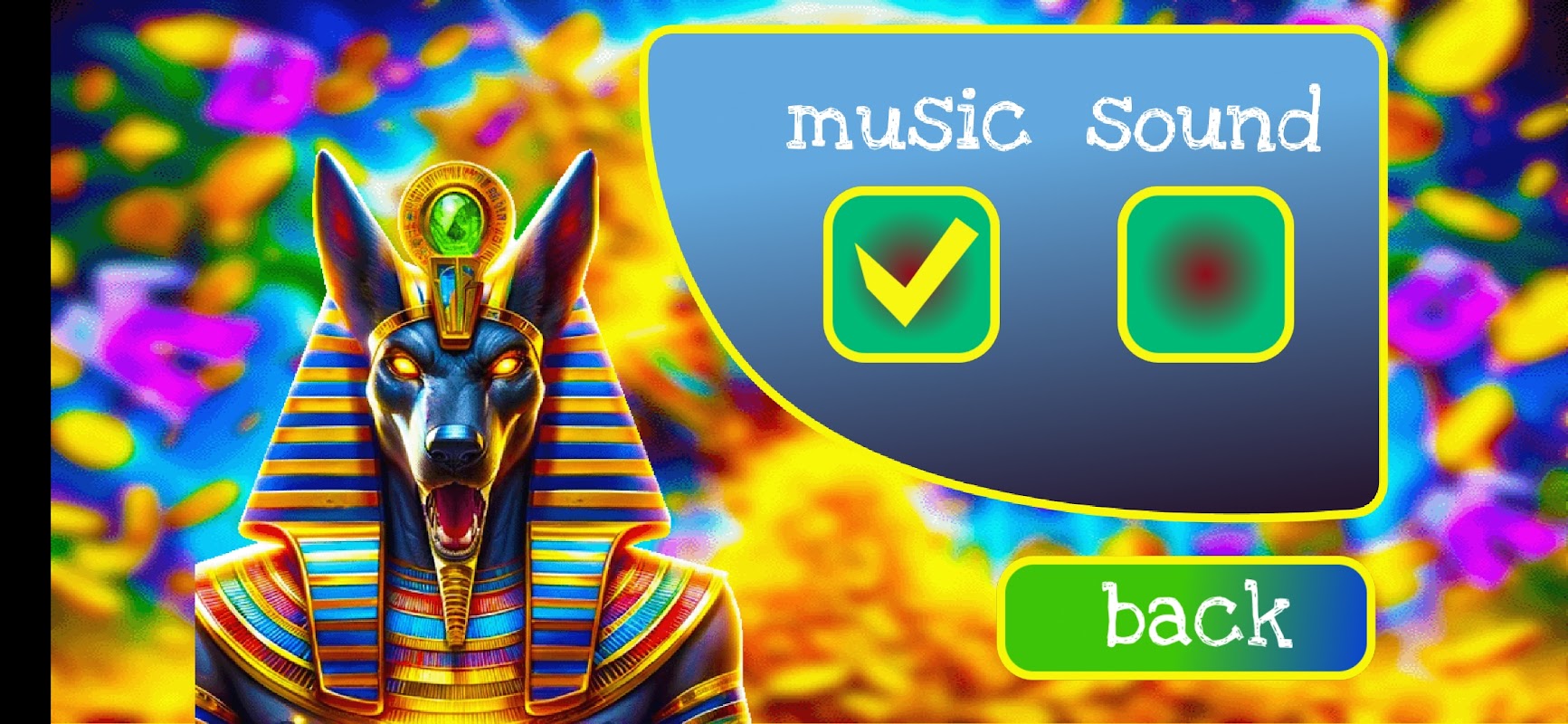 Pegue tesouros de Anúbis no Egito antigo. Personalize o som. Diversão e desafio
